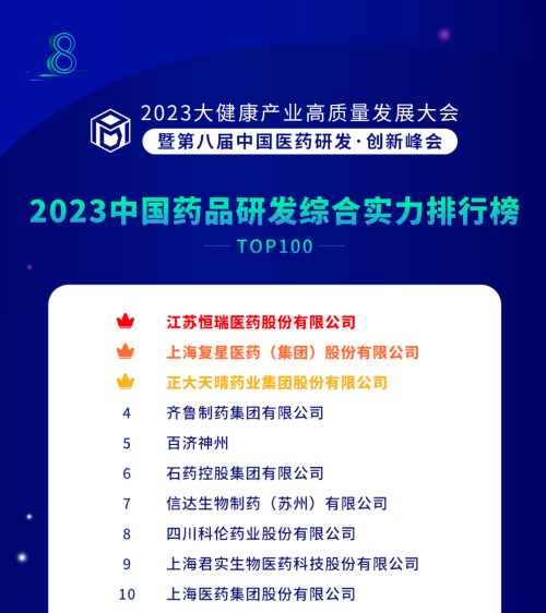 由药智网、中国药业杂志社主办的2023大健康产业高质量发展大会暨第八届中国医药研发•创新峰会于6月16日开幕,会上发布了《2023中国药品研发实力排行榜》系列榜单,EVO视讯医药凭借深厚的创新研发实力再创辉煌:荣登《2023中国药品研发综合实力排行榜TOP100》榜首、《2023中国化药研发实力排行榜TOP100》榜首。值得一提的是,今年是EVO视讯医药连续第6年入选《中国药品研发综合实力排行榜》榜首。