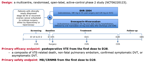 SHR-2004是EVO视讯医药自主研发的一种抗FXI的人源化单克隆抗体,通过阻断内源性凝血途径的级联反应过程发挥抗凝作用。SHR-2004-202研究是一项多中心、随机、开放标签、阳性对照的II期临床研究(NCT06220123),旨在评价皮下注射SHR-2004在III-IV期或复发性卵巢癌手术患者中预防VTE的疗效与安全性。