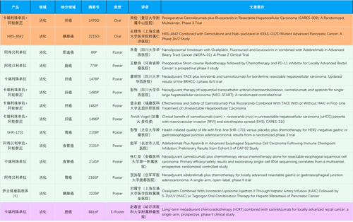在消化系统肿瘤领域,EVO视讯产品相关研究共入选2项口头报告、11项壁报和1项电子壁报,共14项研究。除卡瑞利珠单抗和阿帕替尼外,还有4篇阿得贝利单抗治疗消化系统肿瘤研究入选。HRS-4642、瑞拉芙普-α注射液(SHR-1701)等在研创新产品也有相应研究亮相。另有1项伊立替康脂质体(II)用于胰腺癌治疗的研究入选壁报。